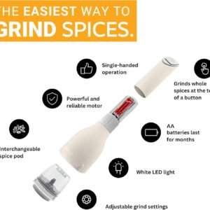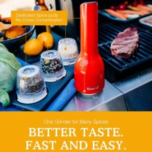FinaMill – Award Winning Battery Operated Pepper Mill & Spice Grinder in One. Adjustable Coarseness. Ceramic Grinding Elements. One Touch Operation with LED Light. includes 2 Quick-Change ProPlus Pods