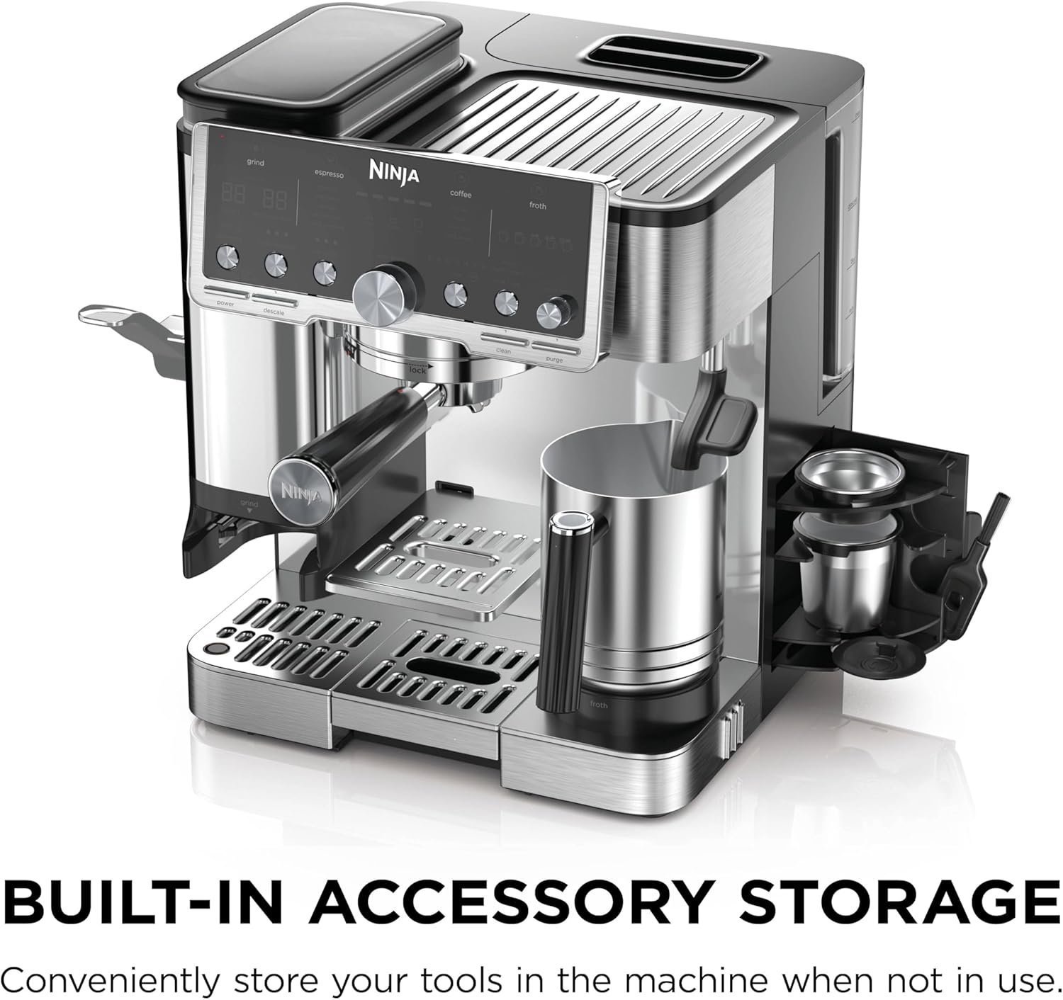 • INTEGRATED TAMPER: Easy, mess-free tamping with the press of a lever.