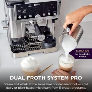 Ninja’s most premium guided experience that makes espresso uncomplicated. The Ninja Luxe™ Café Pro Series is an intelligent espresso & coffee system with 4-in-1 versatility (no guesswork espresso machine, well balanced drip coffee maker, rapid cold brew creator and independent hot water system), that helps you elevate your coffee routine and create café-quality drinks at home. Create perfect pucks at the pull of a lever with the integrated tamper. Barista Assist Technology™ guides you to the perfect cup from grind size recommendations to automated brew adjustments, while the Dual Froth System Pro effortlessly creates perfectly textured microfoam hands-free. Easy-to-clean, insulated steam wand and XL Milk Jug elevate your at-home coffee routine, and create froth for two drinks with 5 preset froth functions including steamed milk, thin froth, thick froth, extra-thick froth, and cold foam.